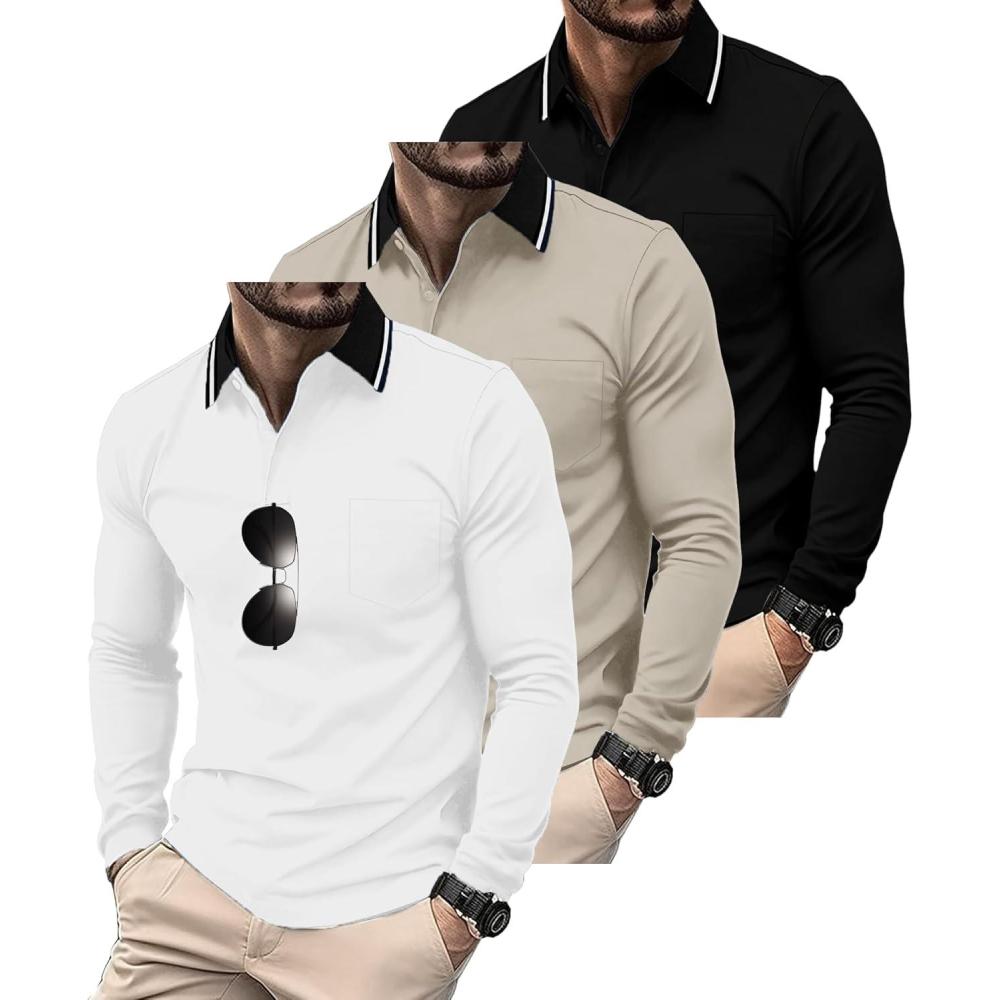 ZITY 3 Pack Men Polo Shirts Long Sleeve with Pocket Golf Shirts Shirts for Men Casual Work Athletic Collared T-Shirts(Black Lightkhaki White)