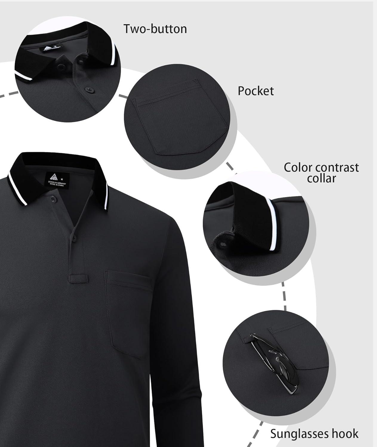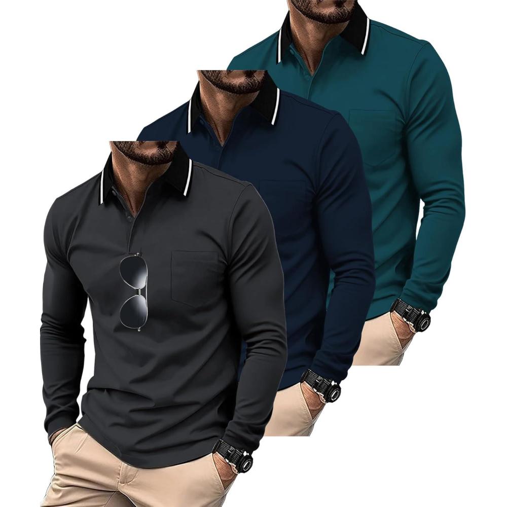 ZITY 3 Pack Long Sleeve Polo Shirts for Men with Pocket Moisture Wicking Outdoor Workwear Office Casual Collared Shirts Fall(Black+royal Blue+dark Teal Blue)