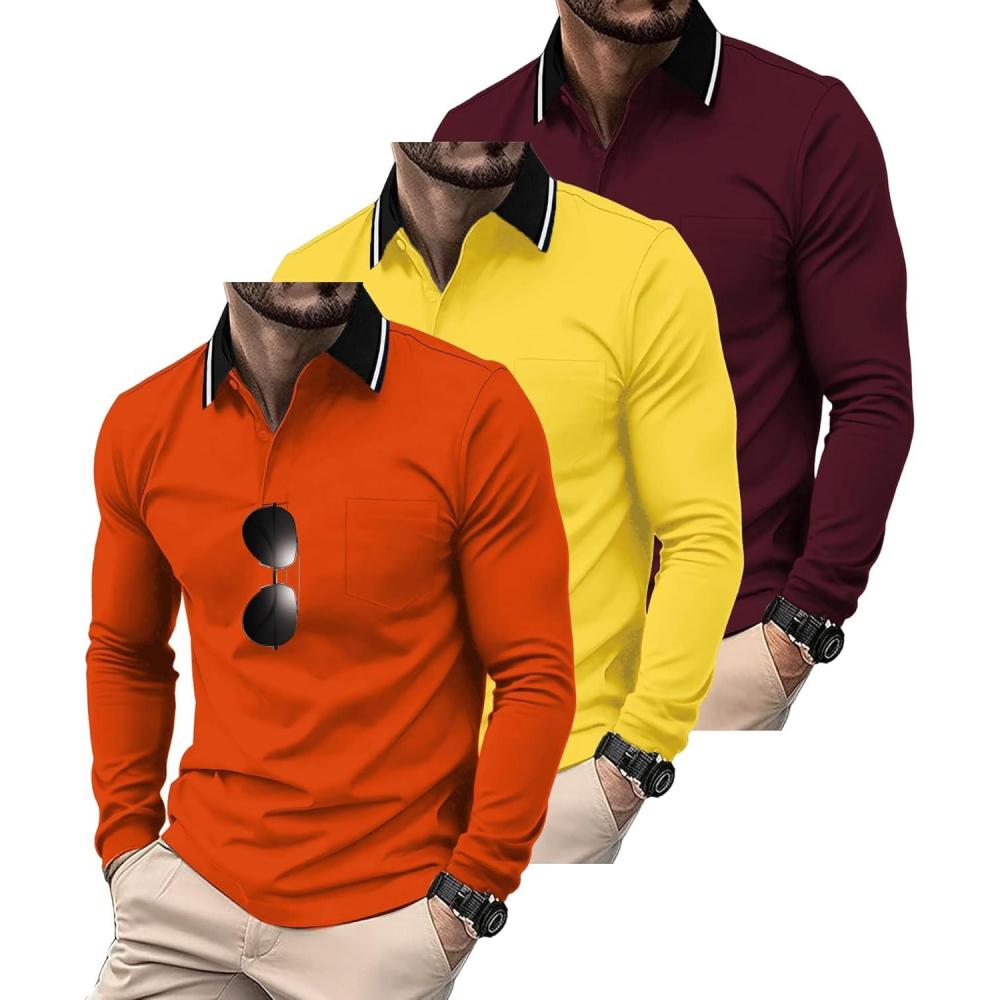 ZITY 3 Pack Men Polo Shirts Long Sleeve with Pocket Golf Shirts Shirts for Men Casual Work Athletic Collared T-Shirts(Orange Yellow Winered)