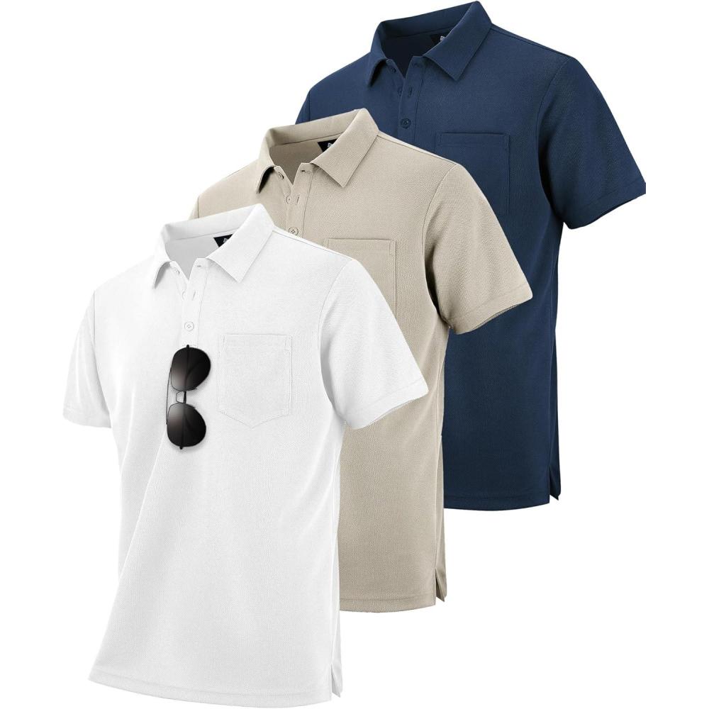 ZITY 3 Pack Polo Shirts for Men with Pocket Short Sleeve Moisture Wicking Outdoor Tactical Shirt Summer Casual(Navy+white+apricot)