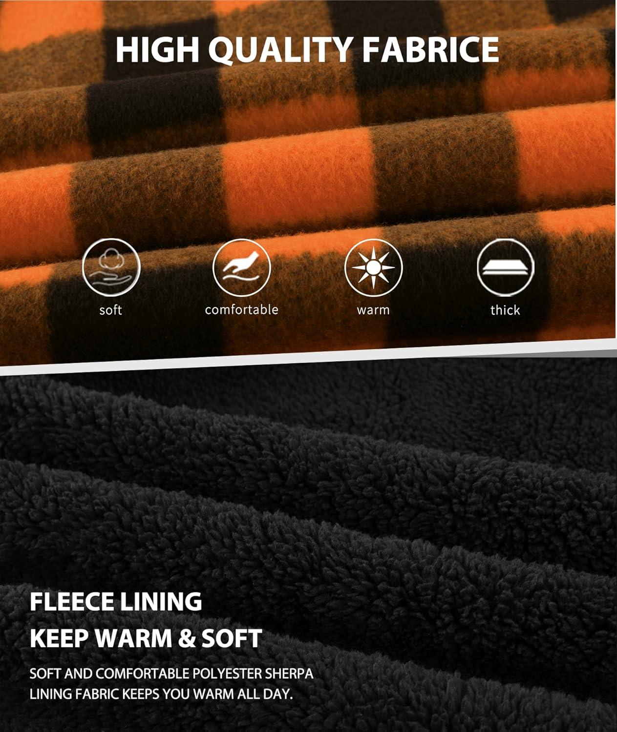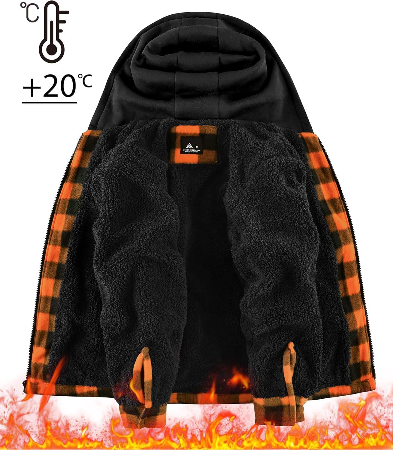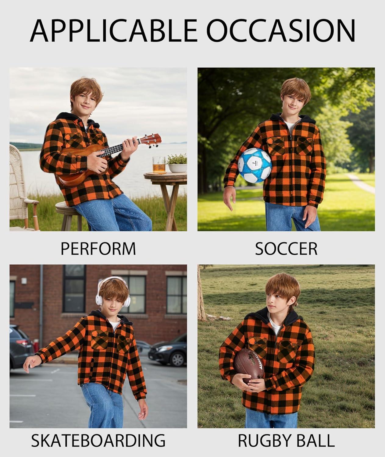 ZITY Boys Flannel Shirt Jacket Fleece Sherpa Lined Plaid Jackets Unisex Coat Full Zip Hoodie Girls Winter Outwear 6-15 Years(Orange Black)