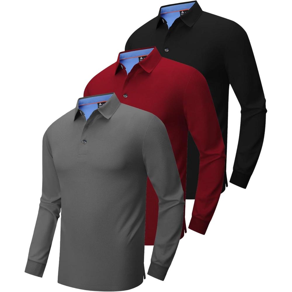 ZITY Long Sleeve Polo Shirts for Men 3 Pack Collared Performance Golf Polos Mens Casual Shirts Moisture Wicking Workwear(Red Black Grey)