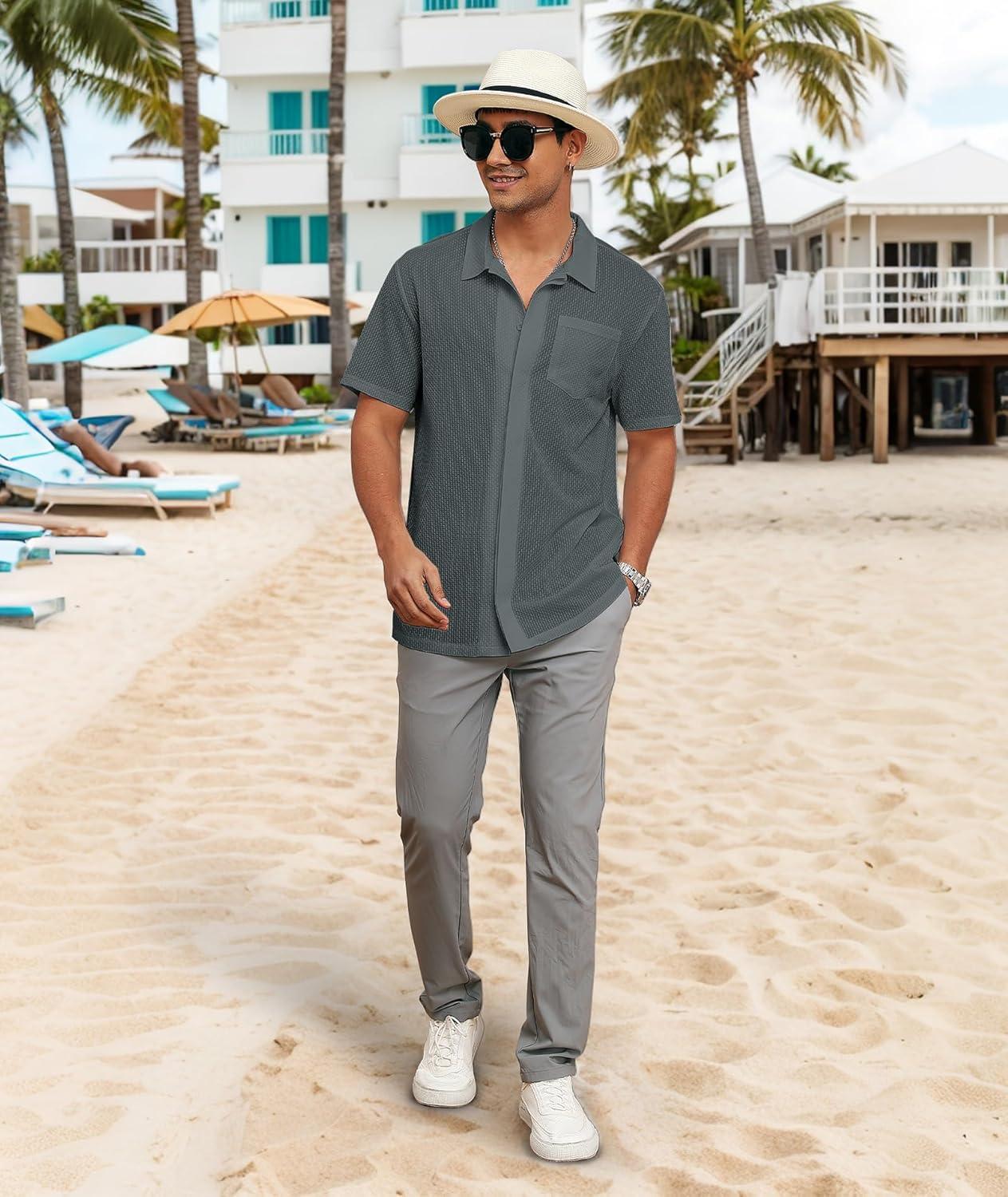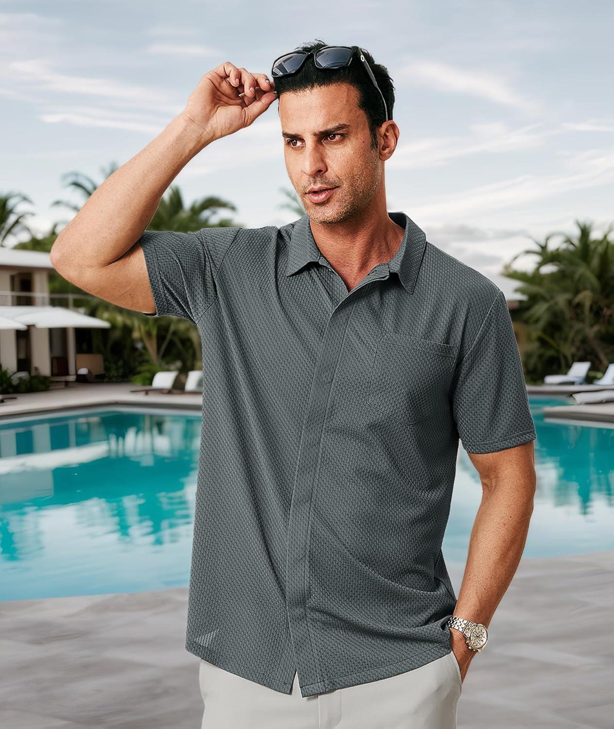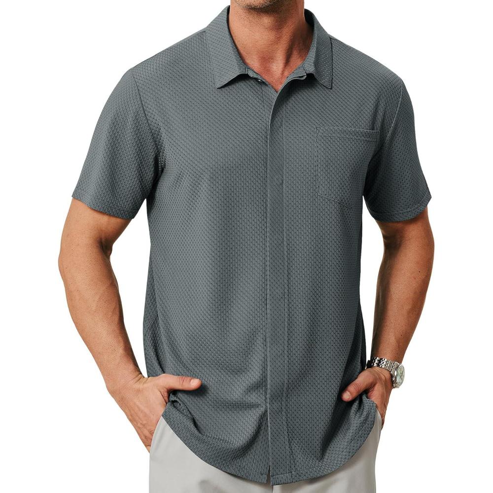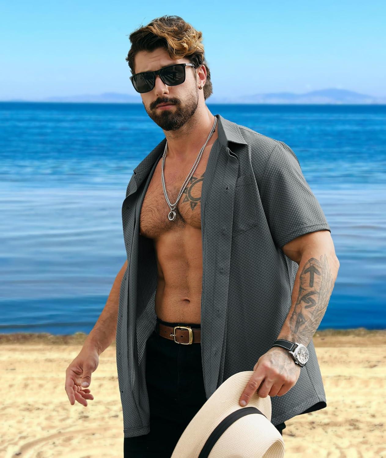 ZITY Mens Casual Hawaiian Beach Vacation Summer Shirt Button Down Short Sleeve Textured Shirts(Grey)