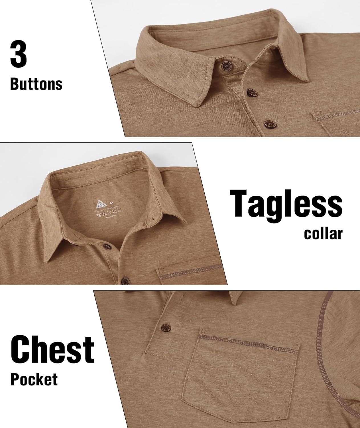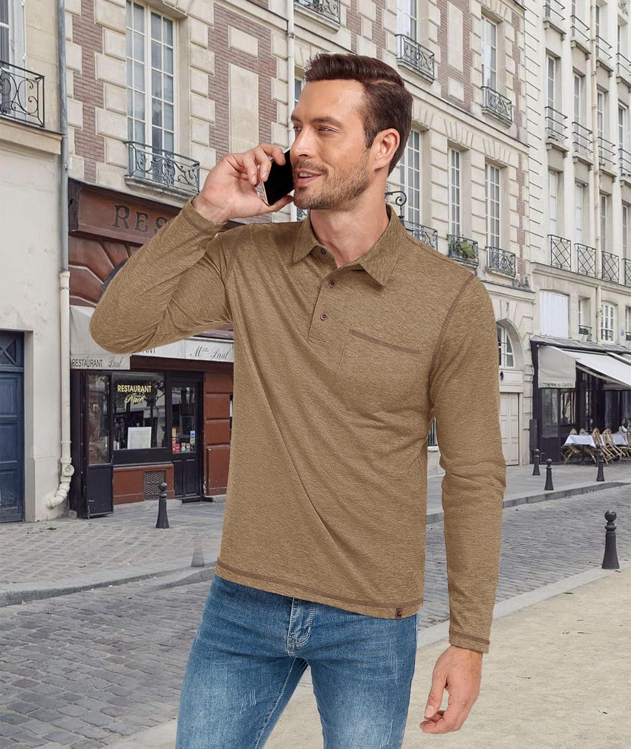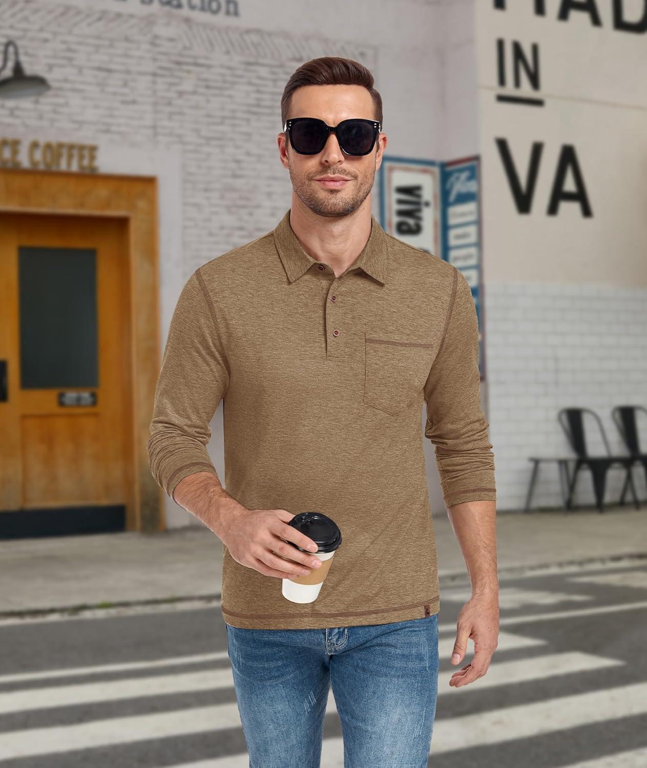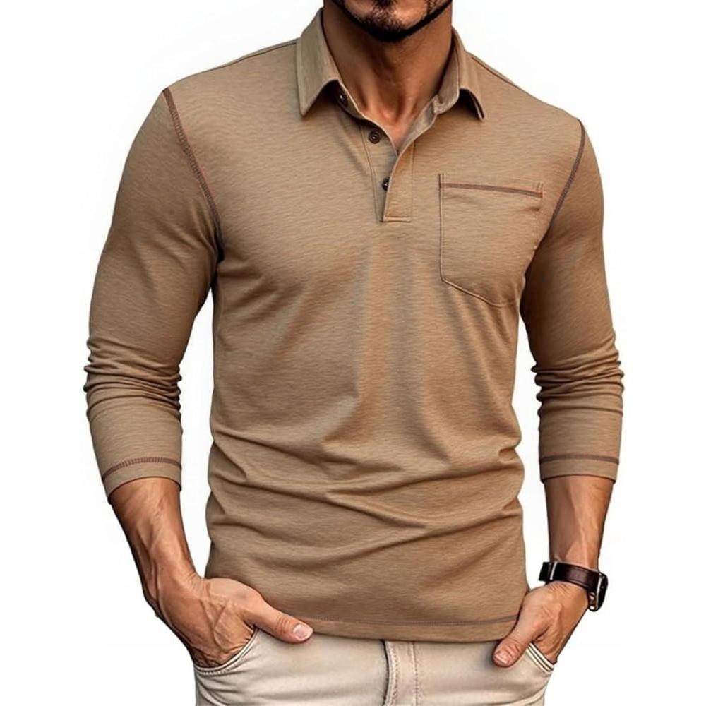 ZITY Men’s Casual Long Sleeve Polo Shirts Classic Button Cotton Work T-Shirt Collared Basic Golf Shirt with Pocket(Khaki)