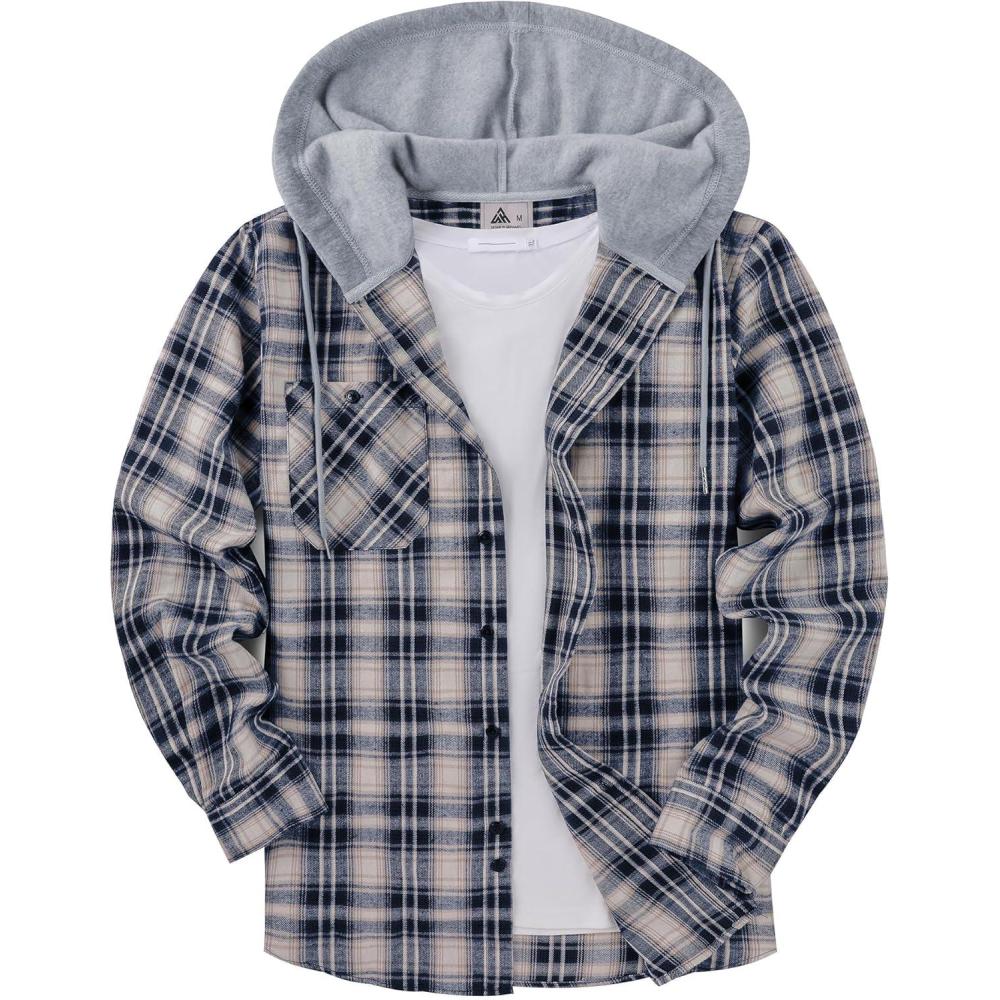 ZITY Men's Flannel Hoodie Shirts Casual Button Down Plaid Shirt Jackets for Men Long Sleeve Stylish Hooded with Pocket(Dark Blue White)