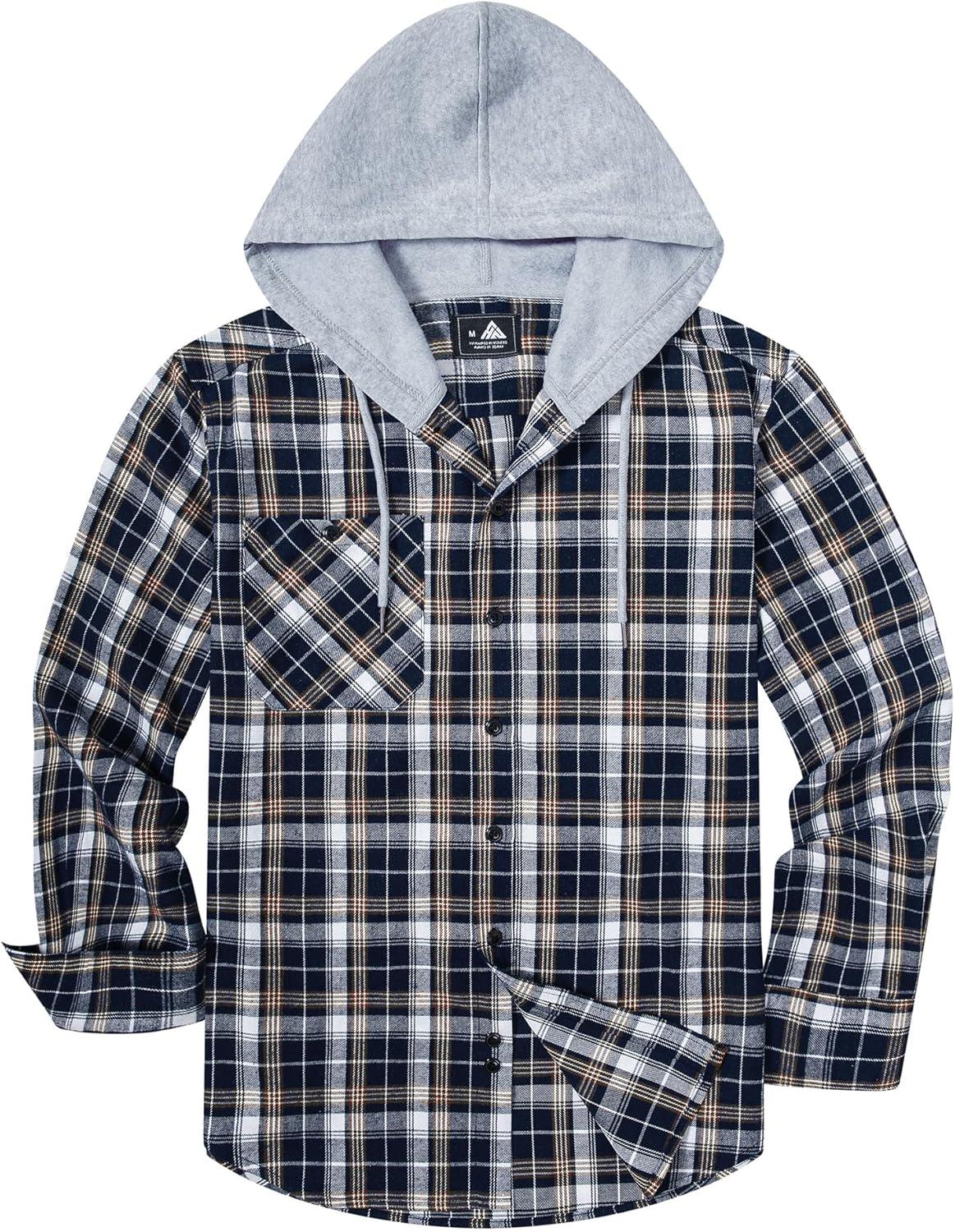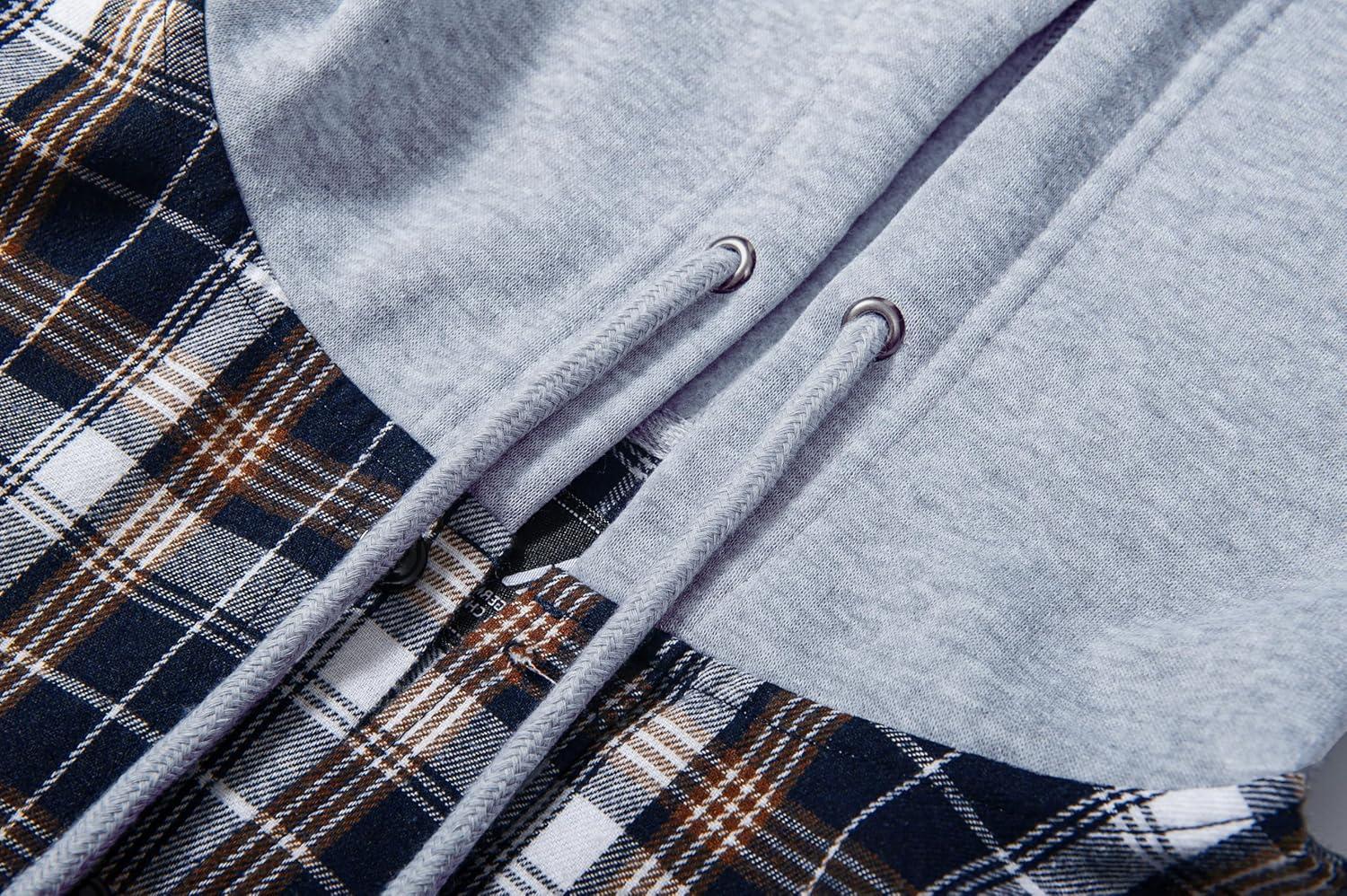ZITY Men’s Flannel Hoodie Shirts Casual Button Down Plaid Shirt Jackets for Men Long Sleeve Stylish Hooded with Pocket(Navy Grey White)
