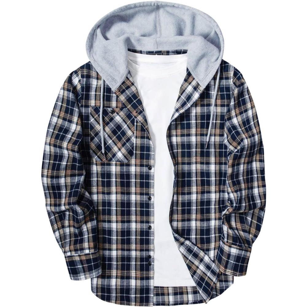 ZITY Men's Flannel Hoodie Shirts Casual Button Down Plaid Shirt Jackets for Men Long Sleeve Stylish Hooded with Pocket(Navy Grey White)