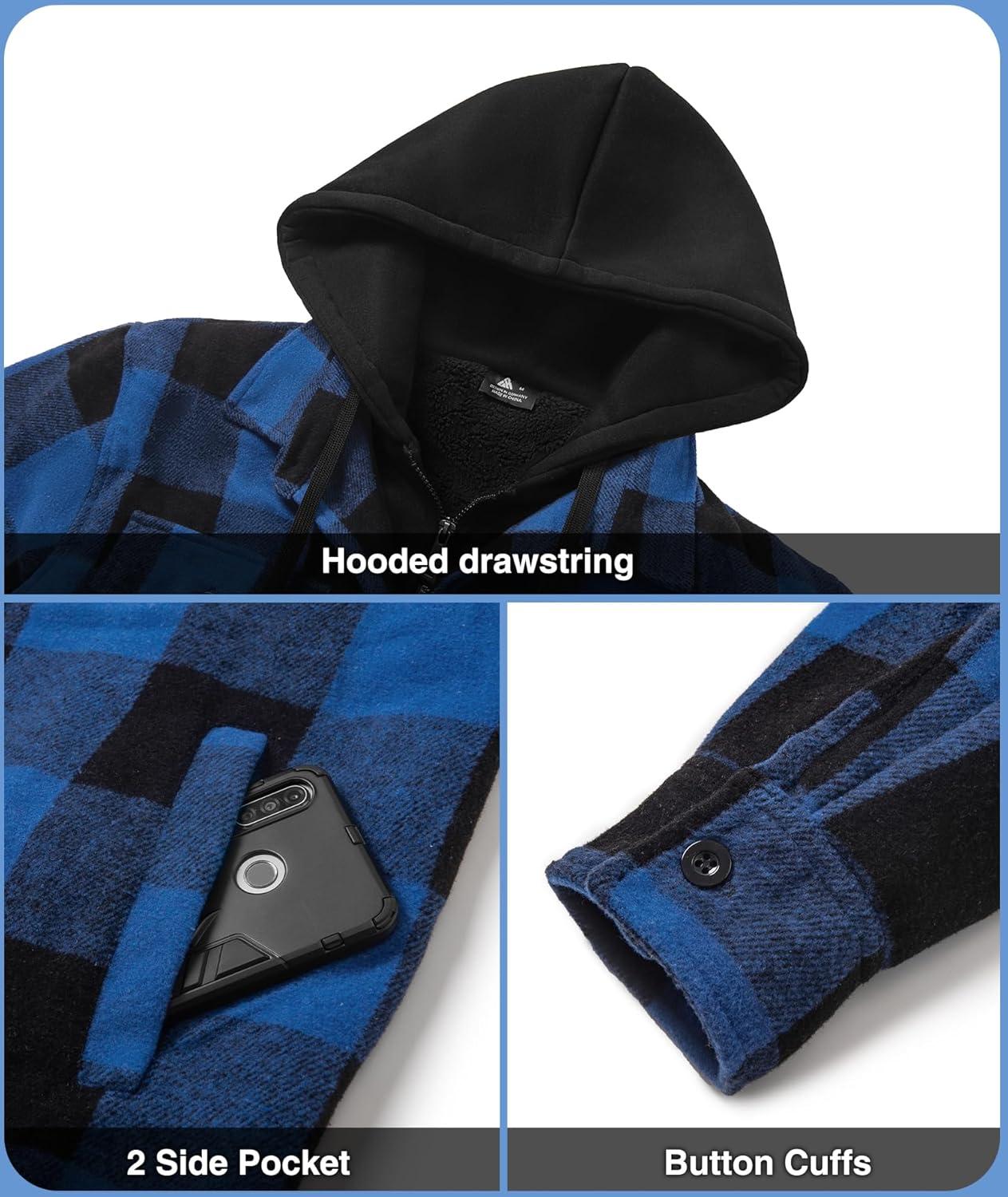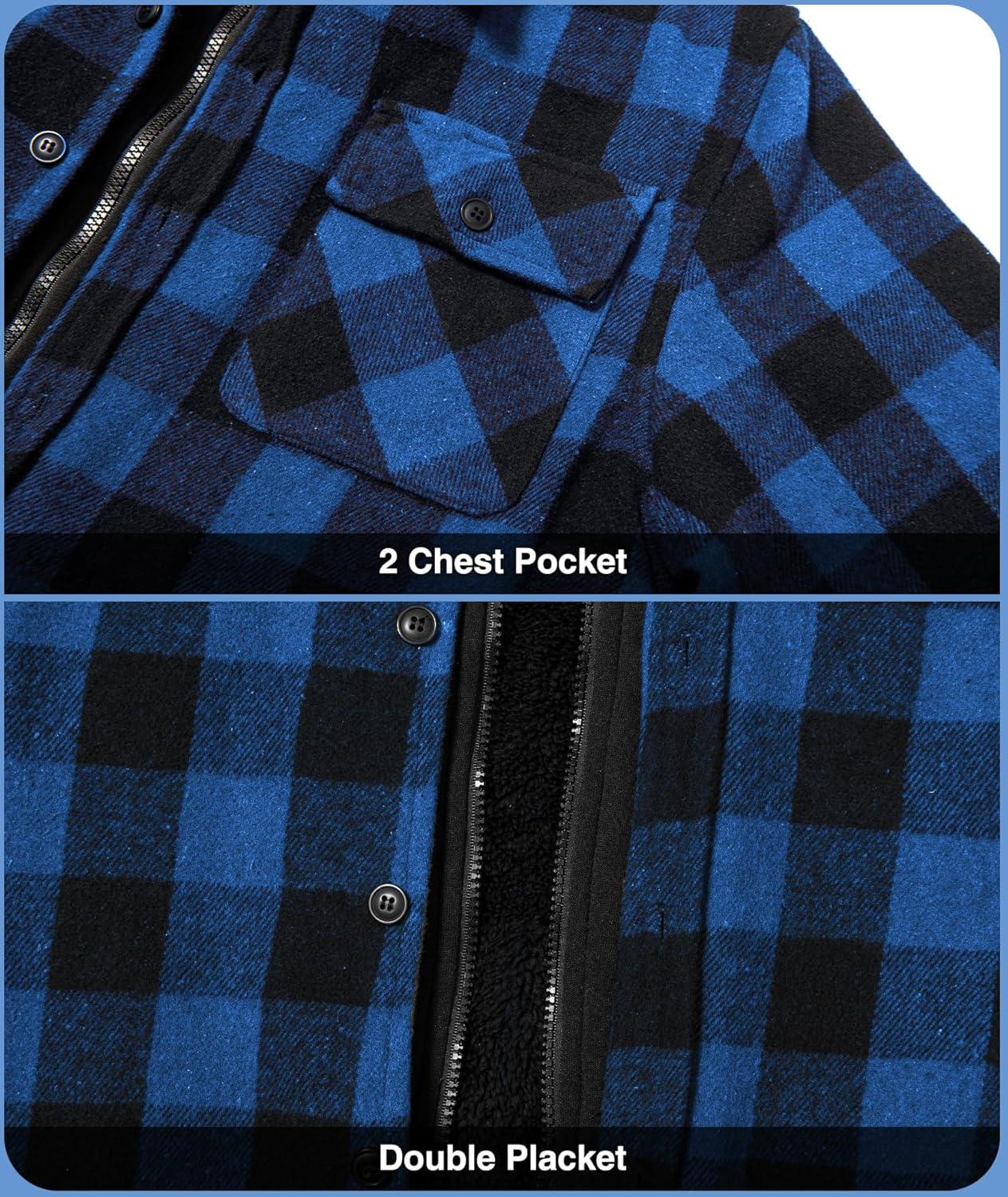 ZITY Mens Sherpa Flannel Shirt Jacket Plaid Fleece Lined Hoodie Full Zip Long Sleeve Winter Warm Coat for Men(Blue)