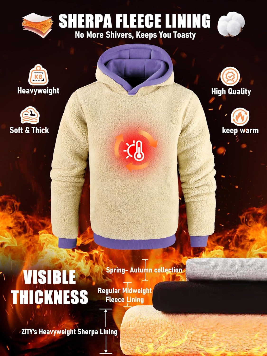 ZITY Men’s Sherpa Lined Hoodie Sweatshirts Heavy Pullover Kangaroo Pocket Winter Windproof Warm Fleece Hoodie Athletic(Purple)