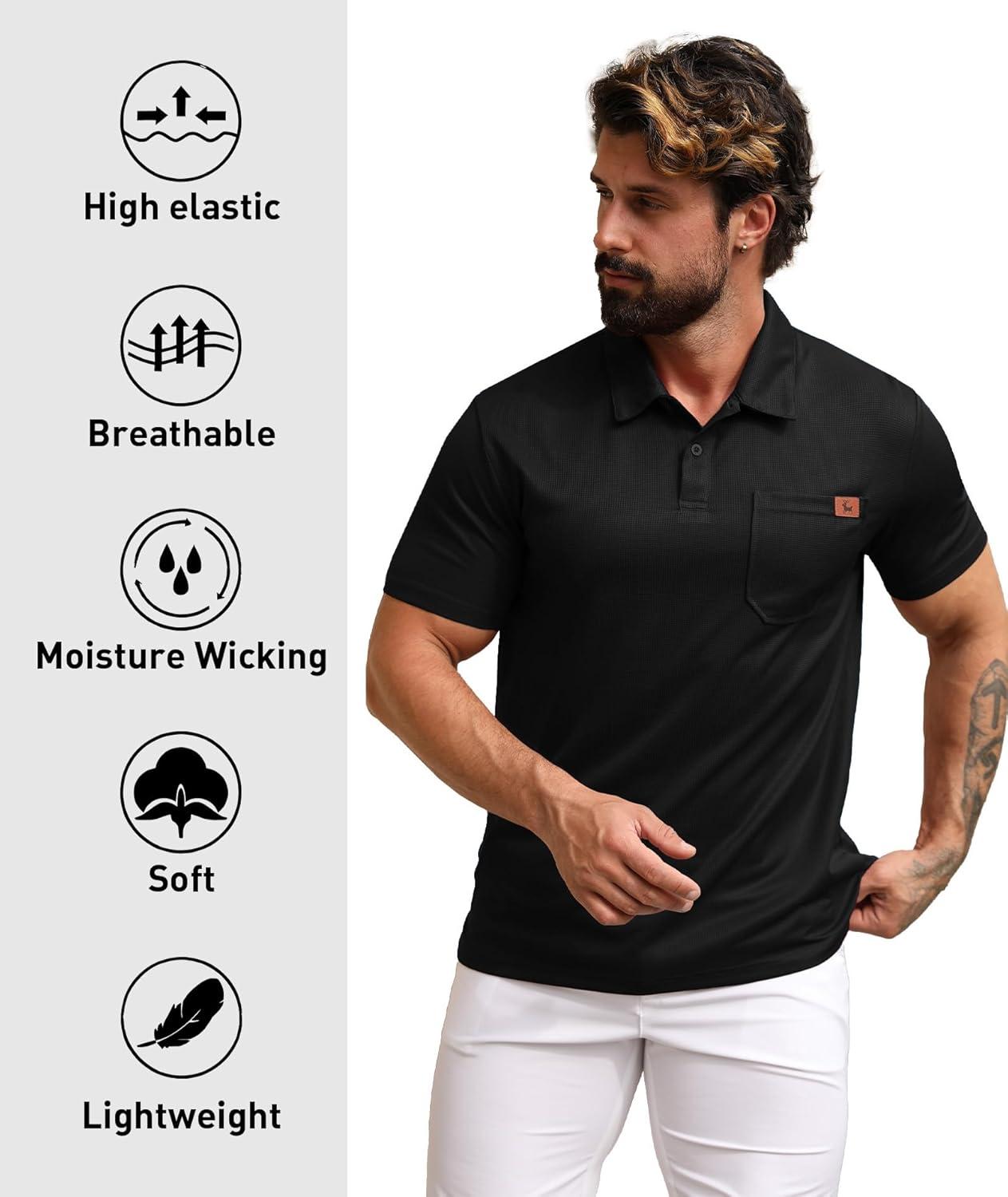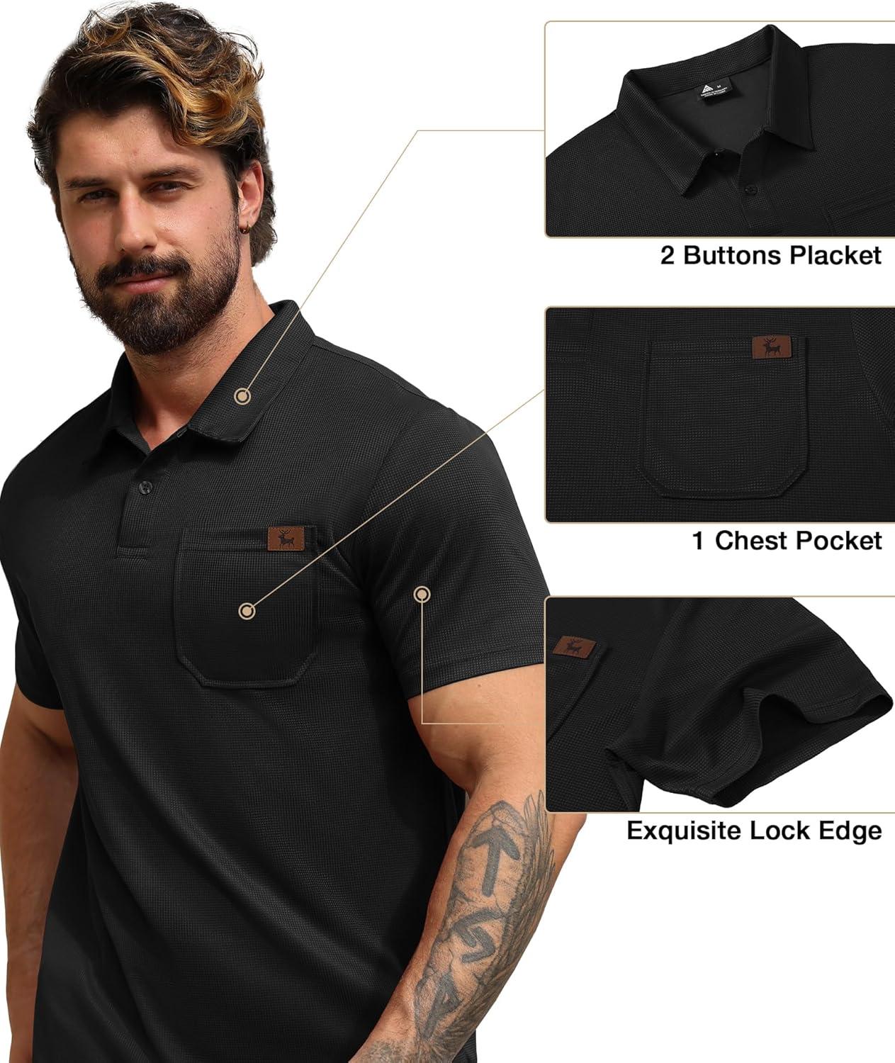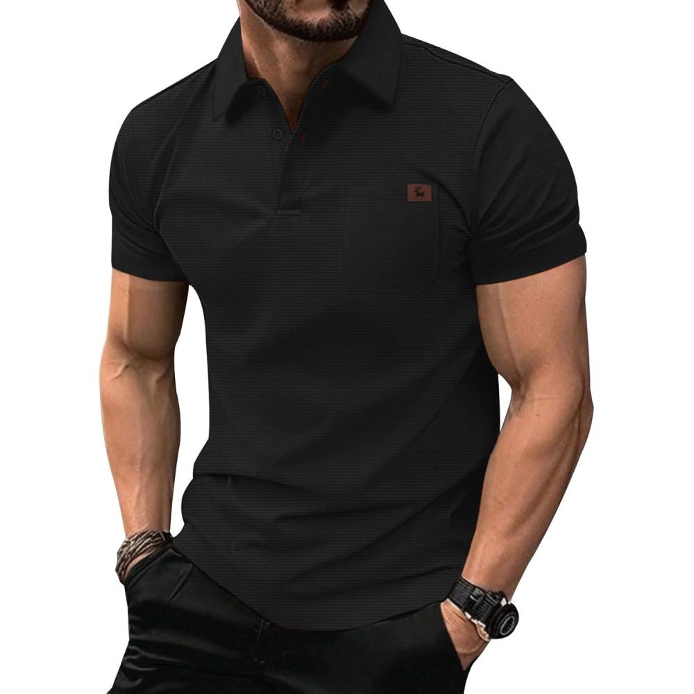ZITY Mens Waffle Polo Shirts Casual Short Sleeve Texture Polo for Men Moisture Wicking Collared T-Shirt with Pocket(Black)