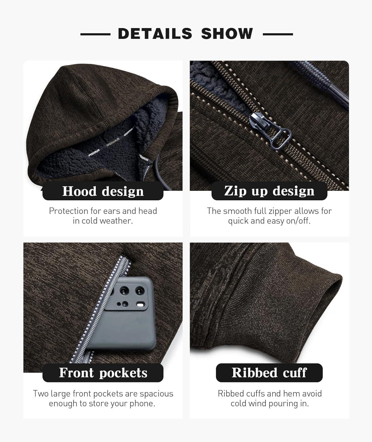 ZITY Men’s Zip Up Hoodie Heavyweight Winter Sweatshirt Fleece Sherpa Lined Warm Jacket(Heather Darkbrown)